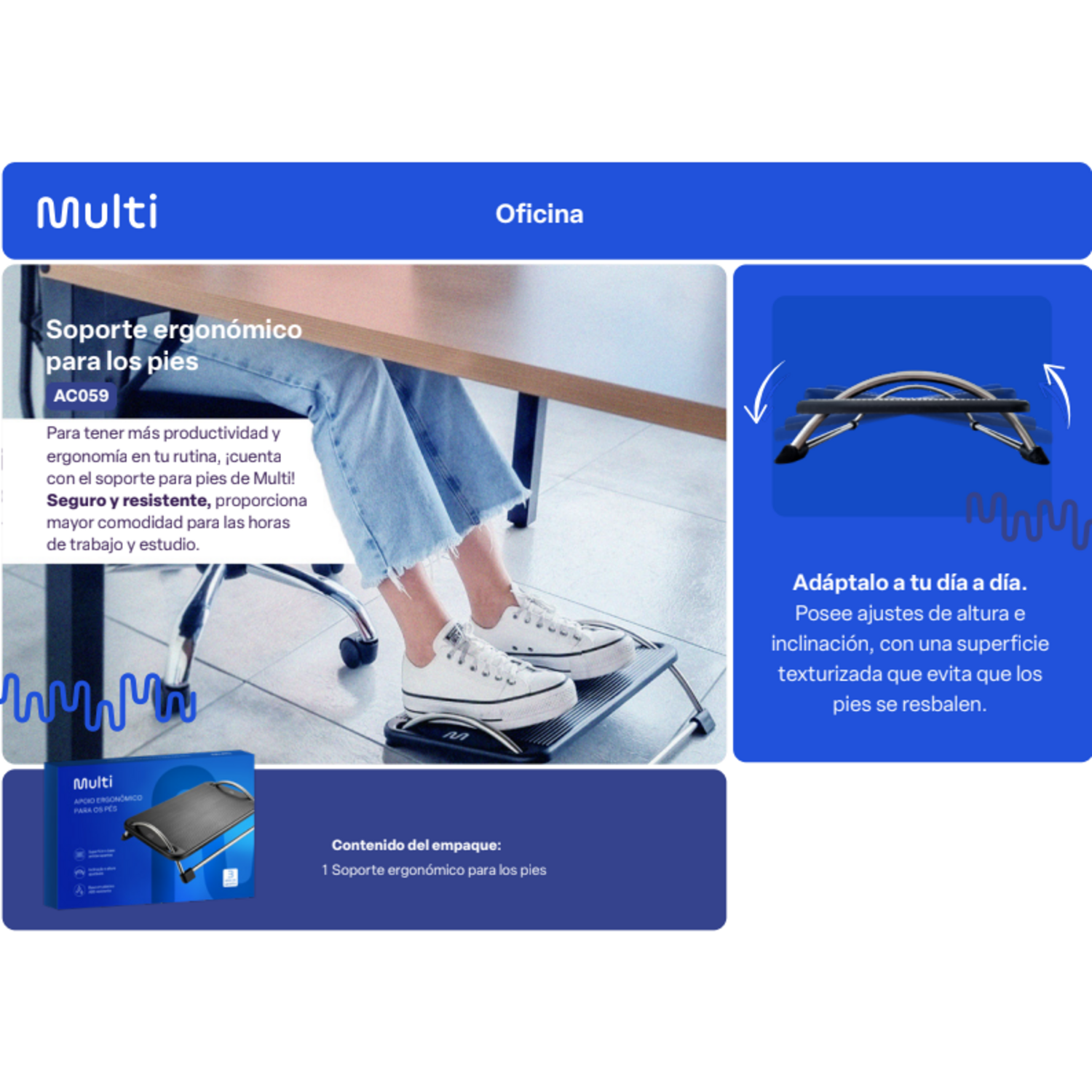 Apoya Pies Ajustable Multilaser AC059 – Comodidad Ergonómica para tu Jornada Laboral Mejora tu postura y reduce la fatiga con el Apoya Pies Ajustable Multilaser AC059, el accesorio ergonómico ideal para oficinas, escritorios en casa o espacios de trabajo compartidos. Diseñado para brindar máximo confort durante largas horas frente al computador, este apoya pies cuenta con una superficie texturizada antideslizante y ajuste de altura personalizable, promoviendo una circulación sanguínea adecuada y una posición corporal saludable. Características destacadas: * Diseño ergonómico ajustable: Inclina y ajusta la altura según tus necesidades para una postura correcta. * Superficie plástica antideslizante texturizada: Masajea suavemente los pies y evita deslizamientos. * Base estable: Fabricada con materiales duraderos que garantizan estabilidad y resistencia. * Soporta hasta 20 kilos: Ideal para un uso prolongado sin deformaciones ni riesgos. * Ideal para oficinas y home office: Compatible con escritorios de cualquier altura. Este reposapiés ergonómico Multilaser AC059 no solo mejora la comodidad, sino que también ayuda a prevenir dolores lumbares, hinchazón en las piernas y fatiga muscular, convirtiéndose en un aliado indispensable para quienes pasan mucho tiempo sentados. Palabras clave: apoya pies ajustable, reposapiés ergonómico, Multilaser AC059, comodidad en oficina, accesorio ergonómico escritorio, mejorar postura en oficina, oficina en casa.