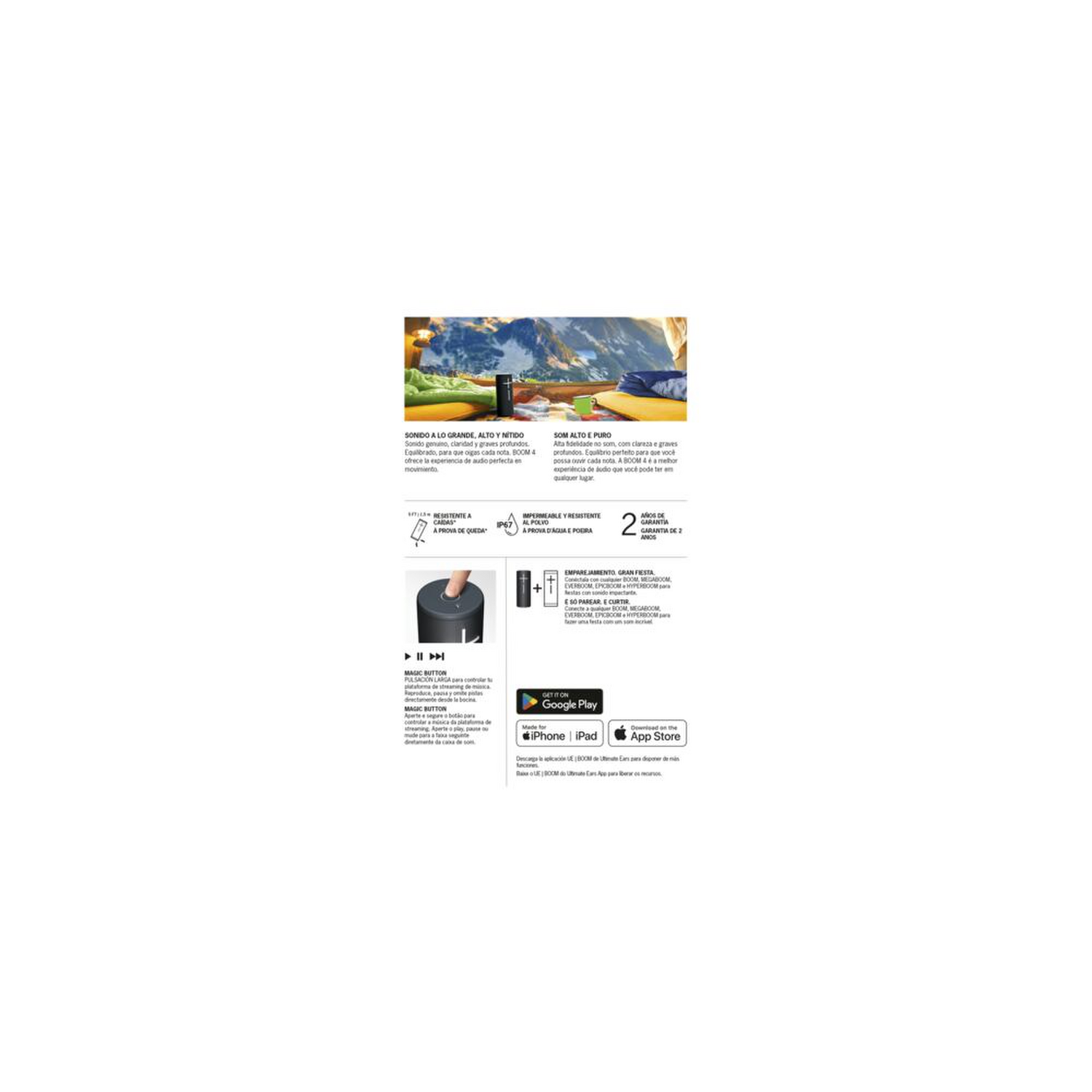 Parlante Portátil Ultimate Ears Boom 4 Negro Disfruta un sonido potente, audaz y equilibrado, todo en una sola bocina Bluetooth® compacta y portátil. Equipada con control de música de un solo toque, grado de protección IP67 a prueba de caídas, agua y polvo, y un impresionante tejido de alto rendimiento, es la bocina definitiva que podrás llevar a todas partes, más audaz y con más graves que nunca. Contenido de la caja ULTIMATE EARS BOOM 4 Correa (acoplada al producto) Cable USB Guía de inicio rápido (impresa dentro de la caja) Dimensiones 73 mm (largo), 73 mm (ancho), 184 mm (alto) Peso 620 g (solo la bocina) Alimentación Batería de ion litio recargable con una duración de hasta 15 horas Sonido de 360° Máximo nivel de sonido: 85 dBC (normal) Transductores: 2 activos de 40 mm y 2 radiadores pasivos de 46.1 mm x 65.2 mm Funciones inalámbricas Radio de acción de 45 metros Compatibilidad Para la reproducción de audio: teléfonos inteligentes, tabletas y otros dispositivos compatibles con Bluetooth [Perfil de distribución avanzada de audio (A2DP)]. Sostenibilidad Mínimo 52% de contenido reciclado posconsumo del total de componentes plásticos. Excluido empacado. AUDAZ SONIDO INCREÍBLE¬MENTE PORTÁTIL ALTO Y CLARO BOOM 4 ofrece un sonido muy potente para su tamaño. Con el exclusivo procesamiento de audio de Ultimate Ears, genera un audio claro y equilibrado, fiel a la música que te gusta y con cualquier nivel de volumen. SONIDO ESPACIAL DE 360° Con su emblemático diseño cilíndrico, fuimos pioneros en ofrecer un audio envolvente y estereofónico que se irradia uniformemente en todas direcciones. GRAVES PROFUNDOS Y PRECISOS BOOM 4 proporciona a tu música graves profundos y enriquecidos. Disfruta graves contundentes sin exageraciones ni distorsiones. MODOS DE ECUALIZACIÓN PREESTABLECIDOS SIGNATURE + 4 Disfruta el sonido Ultimate Ears Signature y varios modos de ecualización (Refuerzo de graves, Espacio reducido, Relajación profunda y Podcast/Vocal) mediante la aplicación UE | BOOM. ¿No encuentras tu favorito? Personalízalo tú mismo PRÁCTICAMENTE INDESTRUCTIBLE BOOM 4 nació para dominar las rutas. Desde arrasar tejados hasta destruir montañas, BOOM 4 tiene lo que necesitas. Cuenta con clasificación IP67, es impermeable, flotante y a prueba de caídas. Llévala a cualquier parte. Es más potente de lo que imaginas. BATERÍA CON DURACIÓN DE 15 HORAS BOOM 4 te ofrece 15 horas* de potencia sónica con una sola carga. Esta bocina portátil incluye una batería de larga duración para seguir festejando. *La duración real de la batería dependerá del uso, la configuración y las condiciones del entorno. CONECTA BOCINAS. PARTYUP PARA OBTENER MÁS DIVERSIÓN: Usa PartyUp* en la aplicación UE | BOOM para emparejar 1, 2, 3... y más de 150 bocinas, y crear una experiencia de sonido insuperable. Puedes combinar varias bocinas BOOM 4, MEGABOOM 4, EVERBOOM, EPICBOOM E HYPERBOOM, o incluso emparejarlas con modelos BOOM de generaciones anteriores. ¿Quieres crear un muro de sonido? Eso está hecho. *Compatible con todos los BOOM, MEGABOOM, EVERBOOM, EPICBOOM, HYPERBOOM altavoces CONTROL MAGIC BUTTON CON UN SOLO TOQUE Un solo toque para sumergirte. Reproduce, pausa y omite pistas directamente desde tu BOOM 4. Configura listas de reproducción con una sola pulsación en tus plataformas de streaming favoritas, como Spotify® y Amazon Music para Android*, y Amazon Music y Apple Music para iOS. HECHO CON PLÁSTICO RECICLADO Las piezas de plástico de BOOM 4 incluyen por lo menos un 52% de plástico reciclado* posconsumo certificado por peso. También fue diseñada para reciclarla. *No incluye el empaque