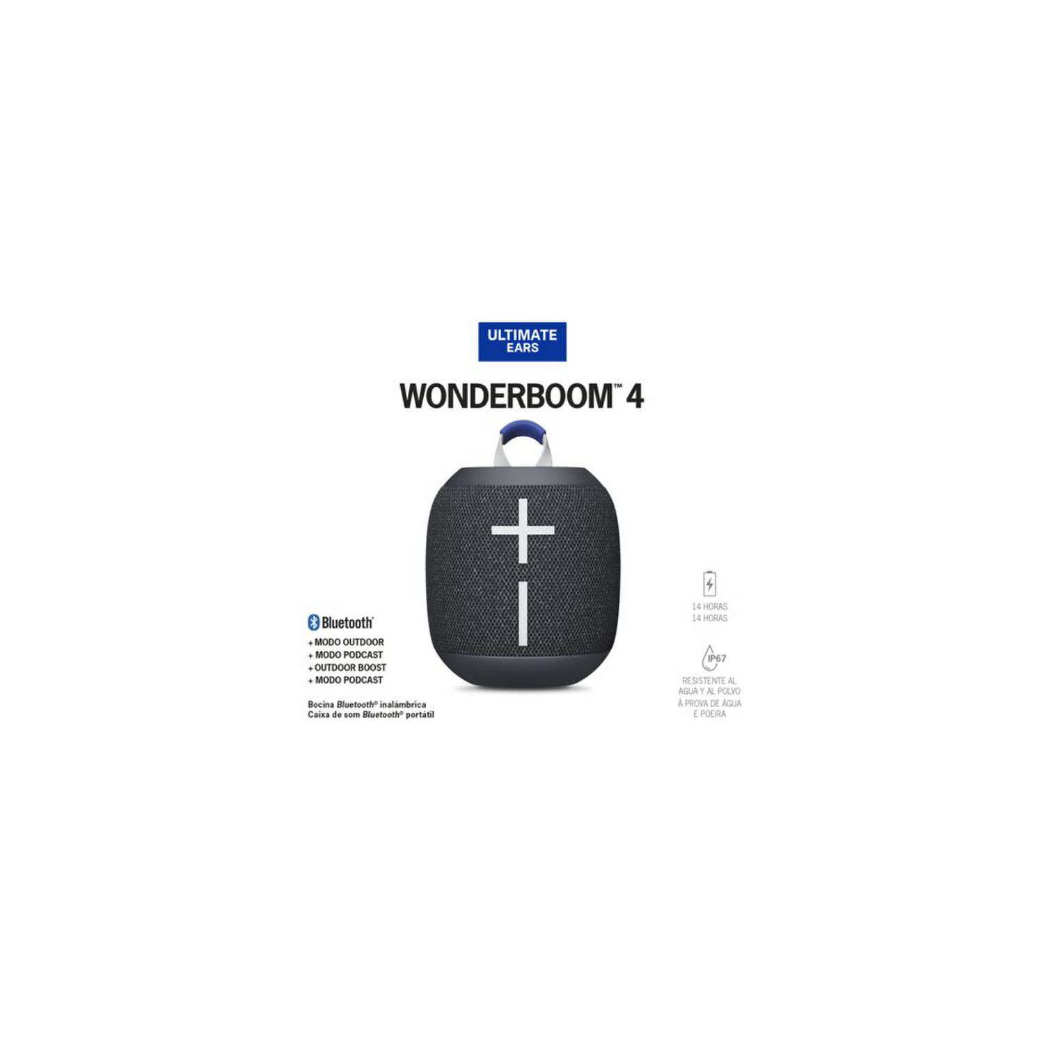 Parlante Portátil Ultimate Ears Wonderboom 4 Negro Bocina Bluetooth® ultraportable con ese sonido notablemente más potente, realmente nítido y rebosante de graves profundos. A tope en interiores y exteriores. Ahora con Modo podcast, ajustado especialmente para escuchar voces nítidas y claras. Contenido de la caja ULTIMATE EARS WONDERBOOM 4 Correa (acoplada al producto) Cable USB Guía de inicio rápido (impresa dentro de la caja) Dimensiones 104 mm (altura), 95.3 mm (DIA) Peso 420 g (solo la bocina) Alimentación Batería de ion litio recargable mediante USB-C con hasta 14 horas de duración entre cada carga. Sonido de 360° Máximo nivel de sonido: 86 dBC (normal) y 87 dBC (modo Outdoor) Transductores: 2 activos de 40 mm y 2 radiadores pasivos de 46,1 mm x 65,2 mm Funciones inalámbricas Radio de acción de 40 metros Conexión simultánea de dos dispositivos de origen. Reproducción inalámbrica (transmisión) en 2 bocinas WONDERBOOM 4 desde una sola fuente Compatibilidad Para la reproducción de audio: teléfonos inteligentes, tabletas y otros dispositivos compatibles con Bluetooth [Perfil de distribución avanzada de audio (A2DP)]. Sostenibilidad Mínimo de 31% de contenido reciclado posconsumo del total de componentes de plástico. Excluido empacado. SONIDO ASOMBRO¬SAMENTE POTENTE DE 360 GRADOS. Consigue ese sonido estéreo potente repleto de graves... todo de una pequeña bocina. Toca el modo Outdoor para obtener un audio especialmente optimizado para los grandes espacios abiertos. NUEVO MODO PODCAST Descubre el nuevo modo de ecualizador, diseñado especialmente para escuchar voces nítidas y claras, y hacer que los podcasts suenen geniales. HORAS DE ASOMBRO WONDERBOOM 4 rinde más tiempo con 14 horas de reproducción. Para que disfrutar cada momento y seguir la fiesta DOMINA EL POLVO, LAS SALPICADURAS Y LAS INMERSIONES La impresionante clasificación IP67 proporciona a WONDERBOOM 4 la durabilidad necesaria para resistir el polvo, la suciedad y el agua. Incluso flota en el agua. Llévala a la piscina, a la playa, al sendero o a la ducha. DUPLÍCALA PARA DISFRUTAR UN VERDADERO SONIDO ESTÉREO Sólo tienes que emparejar dos. Presiona una vez para partida doble. Presiona de nuevo para disfrutar de estéreo pleno de dos canales. Con el sonido del canal izquierdo y derecho bramando desde su bocina respectiva. (No se conecta con WONDERBOOM 1,2, BOOM, MEGABOOM o HYPERBOOM) UNA AUTÉNTICA GUERRERA DEL CAMINO Diseñada para resistir caídas de 1.5 m*. Y con 40 metros de radio de acción inalámbrico, tendrás libertad para explorar, incluso cuando el camino se complique. *A prueba de caídas desde 1,5 m (5 ft). EMPARÉJALA FÁCILMENTE Con un solo toque, WONDERBOOM 4 activa un emparejamiento Bluetooth rápido y sencillo con tus dispositivos Android*. *Teléfonos Android con Marshmallow y posteriores/6.0+ UNA FIESTA PARA EL PLANETA HECHA CON PLÁSTICO RECICLADO Las piezas de plástico de WONDERBOOM 4 incluyen por lo menos un 31% de plástico reciclado posconsumo certificado por peso. "Posconsumo" significa que está fabricado con plástico proveniente de aparatos electrónicos que llegaron al final de su vida útil. Por lo que es literalmente el alma y la vida de la fiesta.