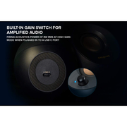 Interruptor de ganancia: activa el modo de alta ganancia cuando se conecta a puertos de 10 W, logrando un volumen superior y sonido amplificado.