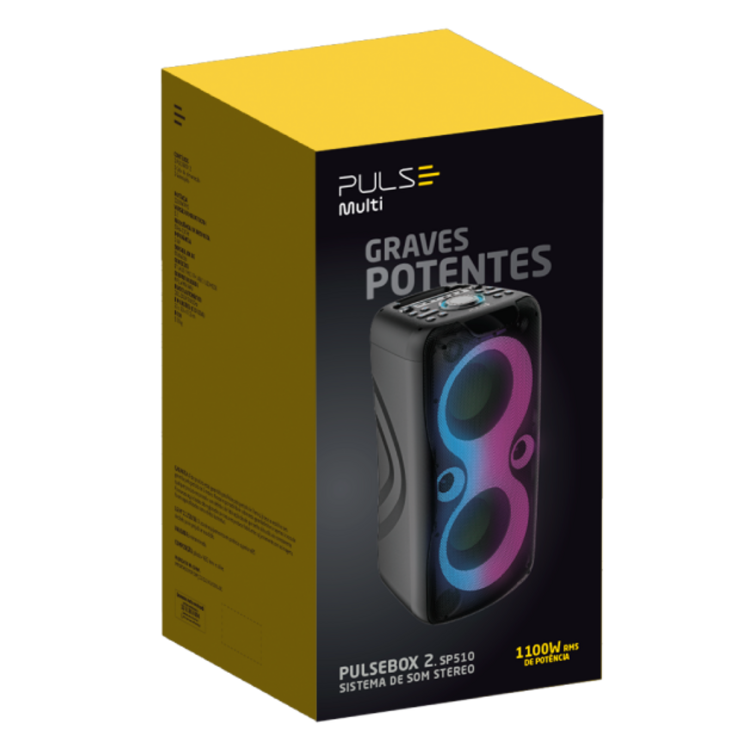 Con la Torre de Sonido Pulsebox 2 SP510 de Pulse disfruta de un espectáculo de luces y potencia de sonido. Aumenta el volumen del sonido de tus listas de reproducción y transforma tu fiesta en una pista de baile. 1100 W de potencia con una gran calidad de sonido. También esta preparada para conectar micrófonos o amplificar una guitarra eléctrica para usar en un pequeño escenario o un bar. Torre de Sonido Pulse Pulsebox 2 Doble 8 Pulg SP510 CONEXIÓN Escucha su lista de reproducción a través de la conexión bluetooth, entrada auxiliar P2 3.5mm, FM, además de tener entrada de micrófono. REFUERZO DE GRAVE Los woofers proporcionan graves realzados y sin ruidos gracias a la función Megabass. EFECTOS DE LED Los LED dinámicos presentes en los woofers delanteros del PULSEBOX 2 lo preparan para animar aún más tu fiesta. Parlante doble de 8 pulgadas (20 cm) cada uno. Dimensiones: 37 cm de ancho, 73 cm de alto y 36 cm de profundidad. Dispones de los siguientes controles: V: Volumen T: Agudos B: Bajos N: Volumen Microfono NT: Agudos del Microfono NB: Bajos del Microfono E: Mic Echo D: Delay G: Volumen de Guitarra NOTA: La torre no tiene batería interna por lo tanto requiere el uso permanentemente conectado a la energía el objetivo de esto es mayor potencia e iluminación Pulse es marca Brasileña perteneciente al Grupo Multi