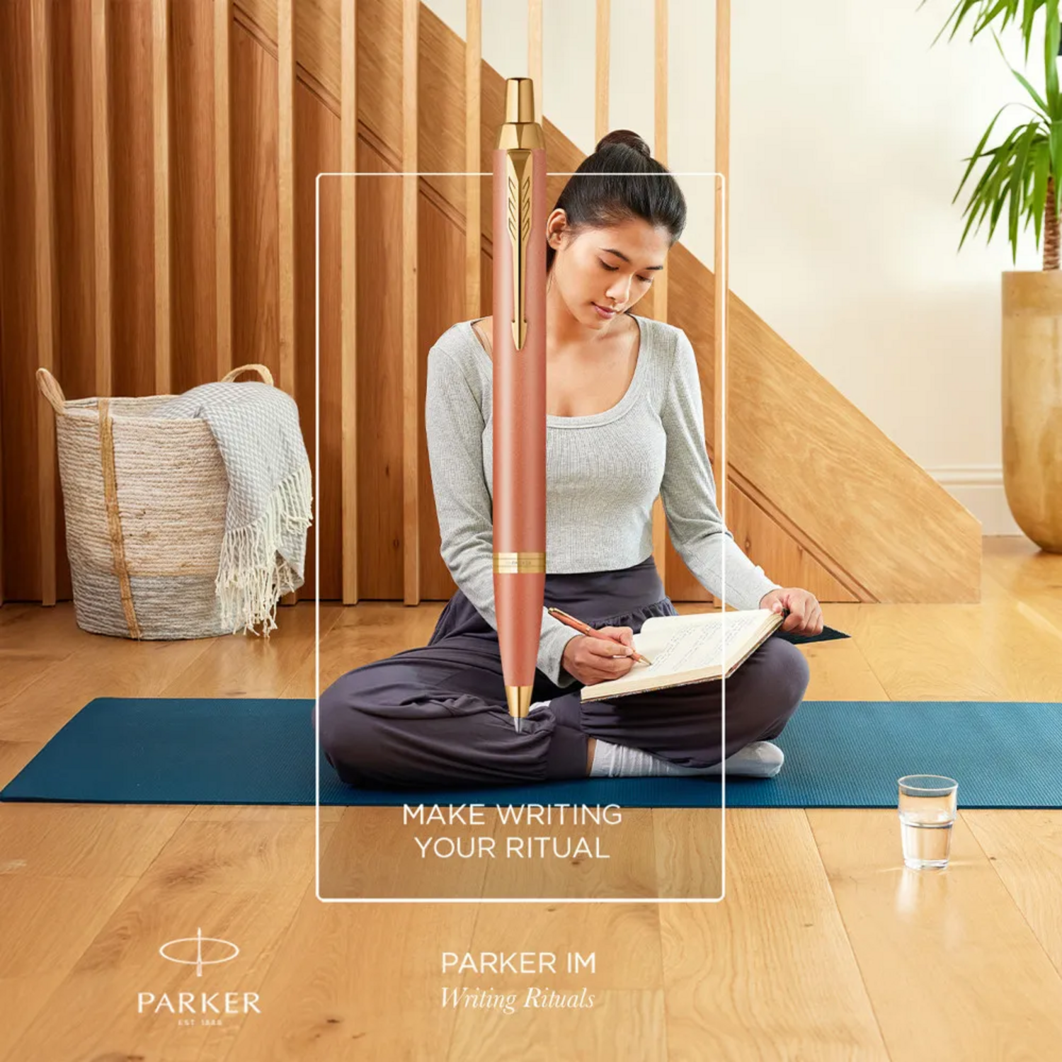 La preciosa colección Parker IM Writing Rituals se ha diseñado pensando en las rutinas de bienestar del escritor. Su peso, su estética, su sensación en la mano y la suavidad de la tinta añaden un elemento de lujo y concentración al ejercicio de la escritura.